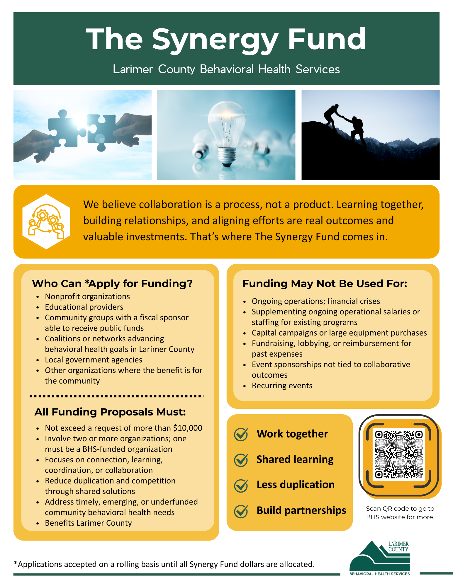This is where The Synergy Fund comes in. It is a new opportunity for community partners to work together toward shared solutions that strengthen our system of care. This fund will support ideas that: