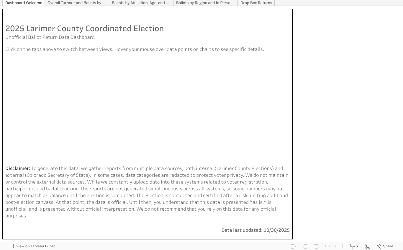 Per the Americans with Disabilities Act (ADA), Larimer County will provide a reasonable accommodation to qualified individuals with a disability who need assistance.  Services can be arranged with at least seven business days’ notice.  Please email us at elections@larimer.gov or by calling 970-498-7820 or Relay Colorado 711. "Walk-in" requests for auxiliary aids and services will be honored to the extent possible but may be unavailable if advance notice is not provided.